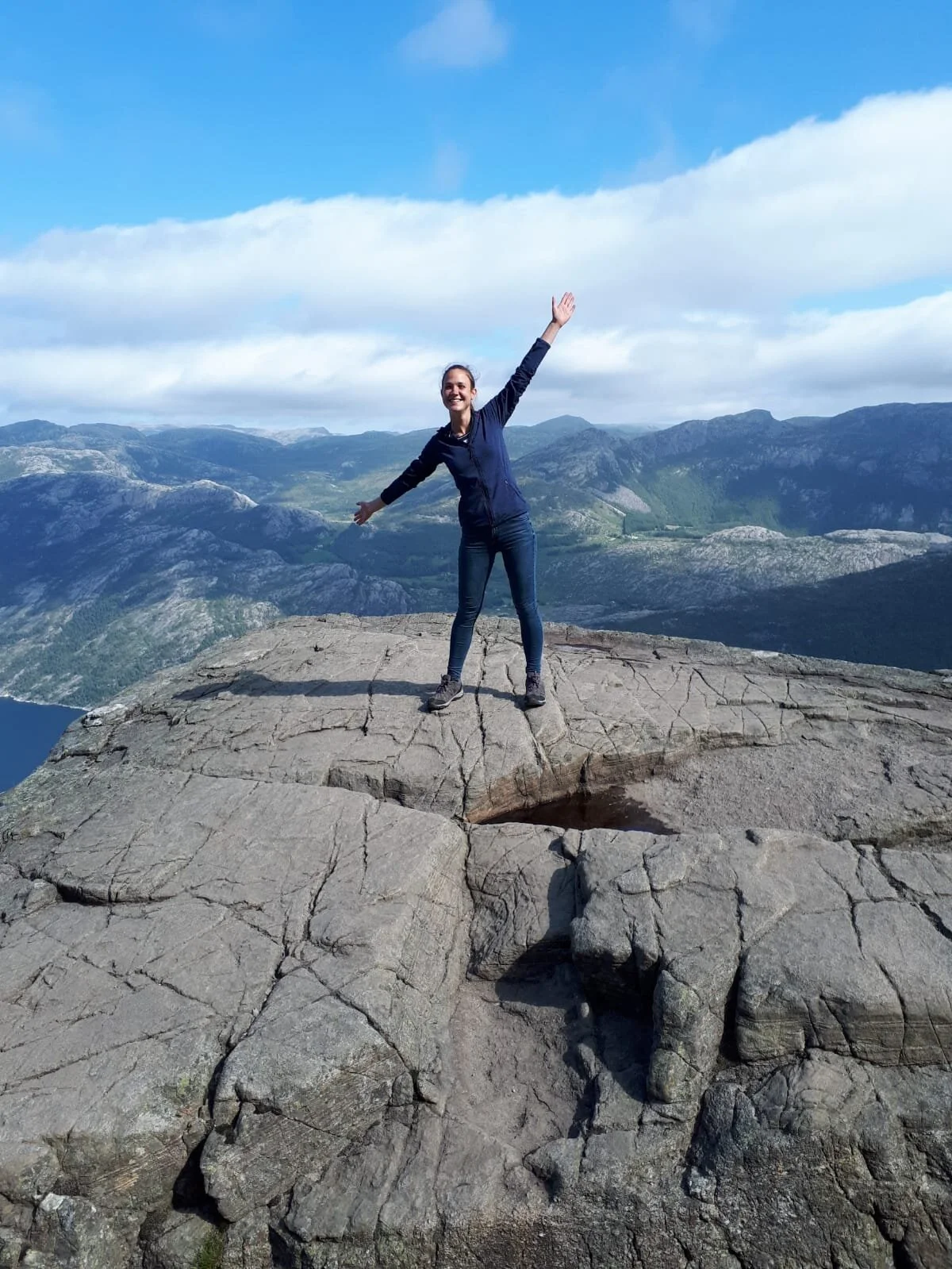 Channa in Noorwegen: “Precies een halfjaar na mijn knie-operatie. We hebben met zijn allen een flinke klim naar de zogenaamde Preikestole (Preekstoel) gemaakt. We hadden geen van alle gedacht dat ik dat al kon lopen, dus dat was een dubbele overwinning. Daarom kijk ik ook zo blij!”